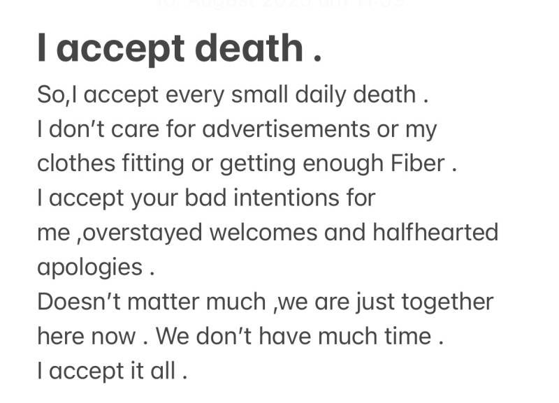 It was a death ,I never was strong enough to mourn . On February the 9th of 2018 my grandma dies ,while I was at the university taking exams . March the 9th ,2018 -the arrival in Germany . Ever since I "meet "her at the 9th in a magical way and life here where I am now became so round-and I'm glad it's not linear ,because I went back a couple of timelines and experienced daily deaths and eventually learned how to mourn and take death as it is and I think at the end of this trip , I came back to find myself ,I came back to my philosophy and my own rebirth .It takes to pass away a lot , to be born again .